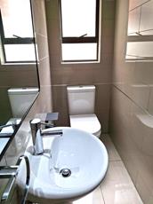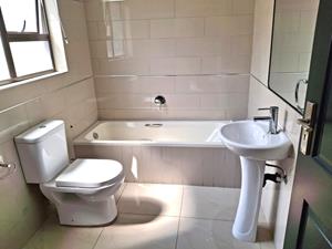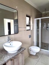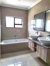 - Main bedroom with a full en-suite bathroom, featuring a shower, bath, twin basins, and toilet, along with ample cupboard space.