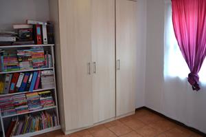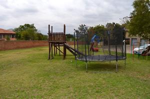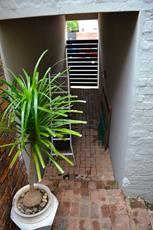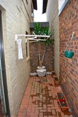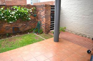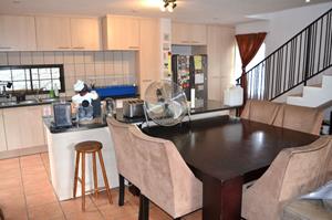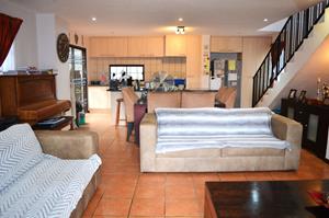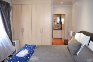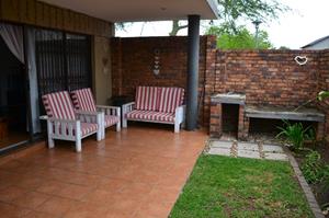 The living area is open plan to the kitchen with granite tops. The kitchen offers a beautiful island that divides the living area and kitchen. There is ample cupboard space. The living area walks out onto the patio with a built-in-braai that overlooks the quaint garden.