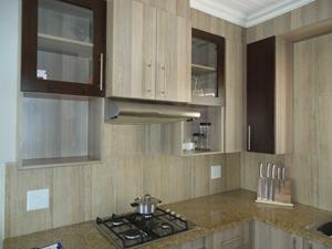 Step inside to find an open-plan kitchen and living area, ideal for entertaining or relaxing. The kitchen is equipped with sleek melamine cupboards, elegant granite countertops, a gas hob, and an undercounter oven, providing a stylish and functional space for culinary enthusiasts.