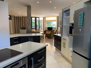 The open-plan living area includes a cozy lounge, dining room, and a state-of-the-art kitchen. The kitchen is a chef’s dream, complete with ample cupboard space, a breakfast nook, a cold room, an island featuring an under-counter oven, a glass-top stove, an extractor fan, and luxurious Caesarstone countertops.