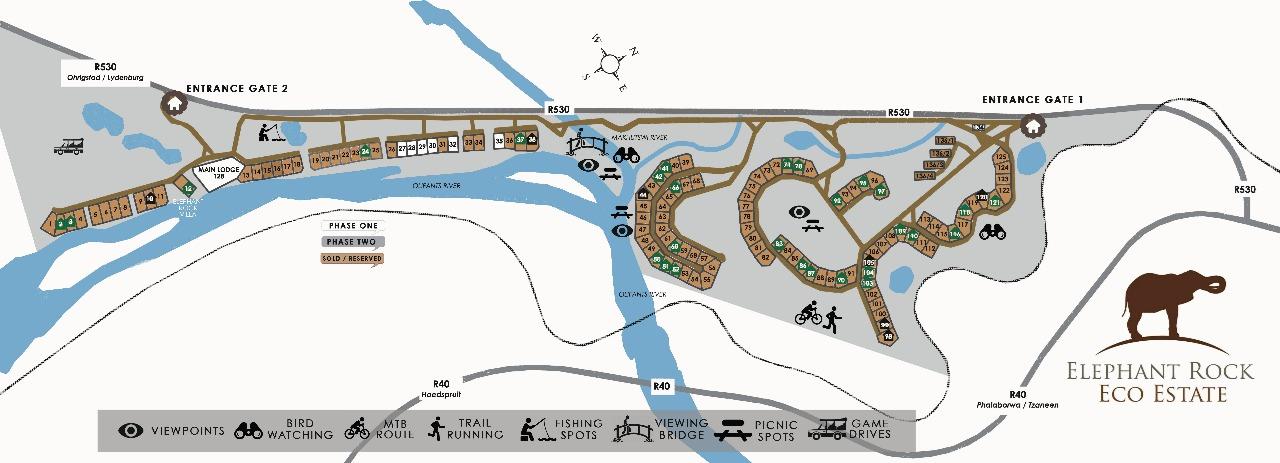 Stand sizes in the Estate vary from 2400sqm to 3303sqm - All stands have a different location and views in the Estate - some on the majestic Olifants River, meandering through the Estate, some with a dry riverbed on the river, as well as game phase area views, and others have a more bushy and hillside view.