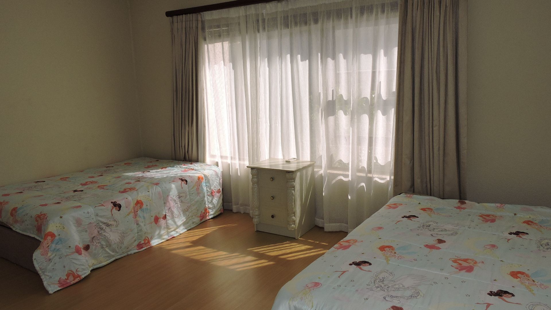 Upstairs, the home boasts three generously sized bedrooms. The main bedroom is a sanctuary with an en-suite bathroom that includes an oval corner bath, a large shower, double basin, and toilet. This room also delights with an east-facing balcony and a very large west-facing balcony, perfect for enjoying morning coffee or evening sunsets. The second and third bedrooms are extra large and share a beautifully appointed bathroom with a shower, toilet, and basin. Every bedroom is equipped with air conditioning to ensure comfort throughout the seasons.