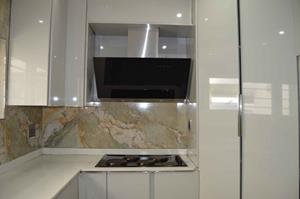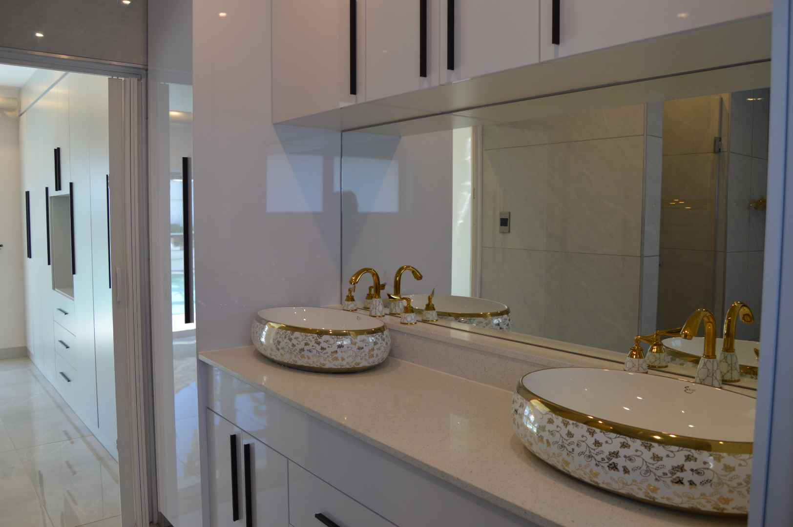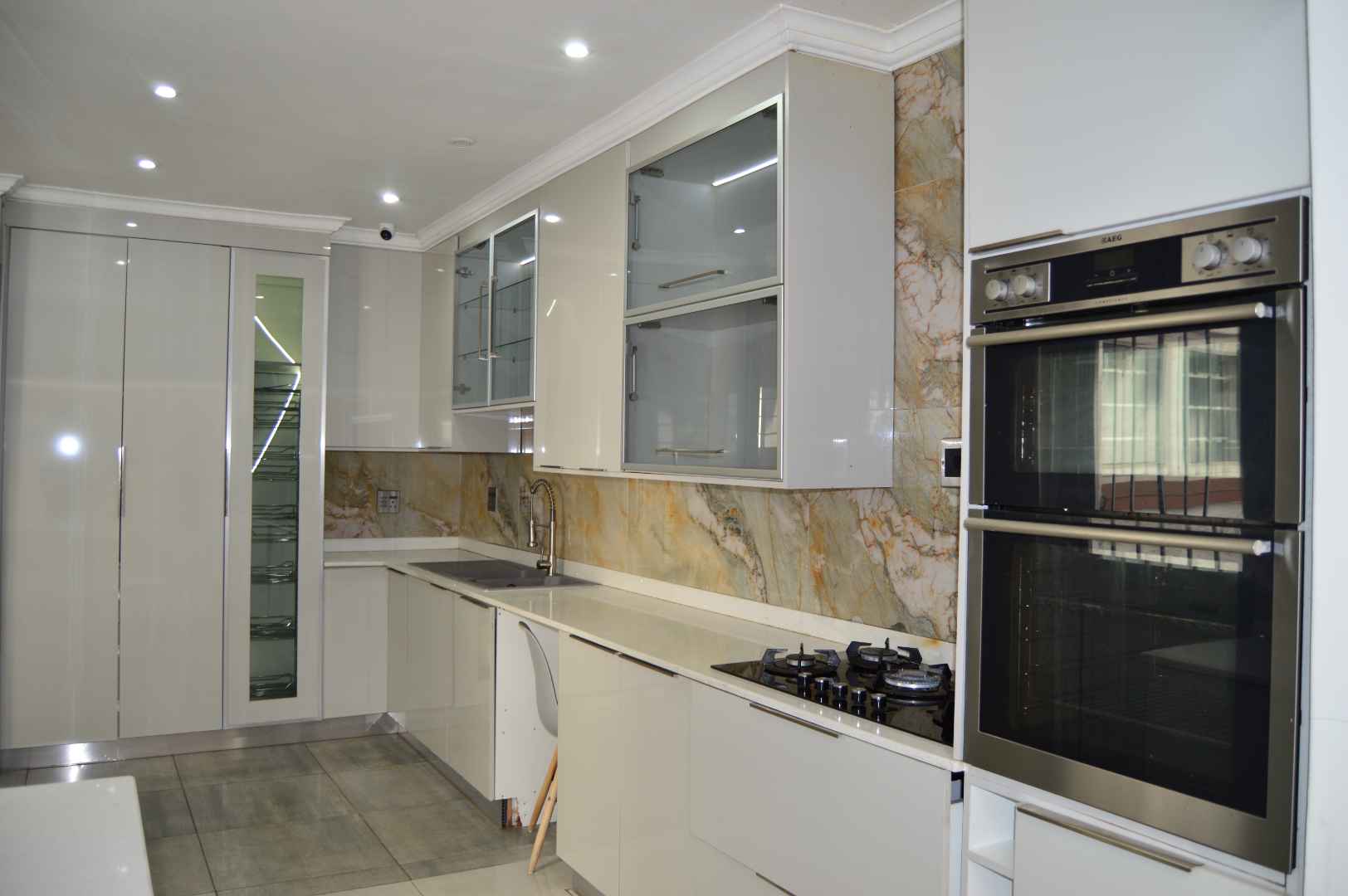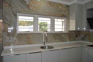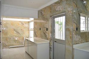 The home boasts a private study or office with an external door, ideal for those who require a serene workspace. The kitchen is a chef's delight, featuring granite countertops, marble walls, and modern white cupboards, all beautifully tiled to enhance the aesthetic.