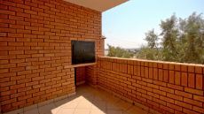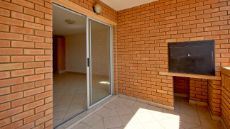 The open-plan kitchen features generous storage, black stone work-surfaces, space for two appliances, and a breakfast nook. The living room is bright with a covered balcony and a built-in braai.