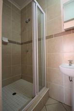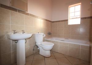 The main bedroom is a generously sized room with built-in cupboards and an en-suite bathroom complete with a toilet, basin, and shower. The second bedroom is medium-sized with built-in cupboards, and the second bathroom is a shared space with a toilet, basin, and bath.