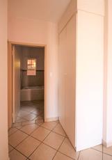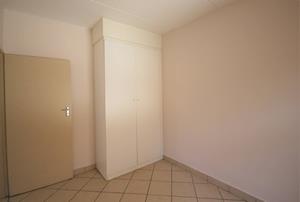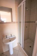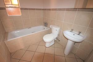 The main bedroom is spacious with built-in cupboards and an en-suite bathroom complete with a toilet, basin, and shower.