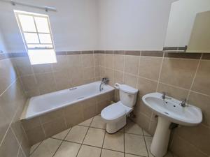 The remaining bedroom is a medium-sized room with built-in cupboards. The second bathroom is a shared bathroom, complete with a toilet, basin, and bath