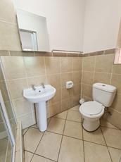 Main Bedroom: Generously sized with built-in cupboards and a private en-suite bathroom, including a shower, basin, and toilet.