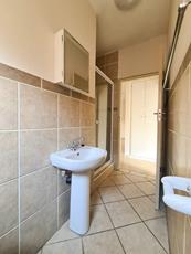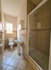 Second bedroom with built-in cupboards and a shared bathroom with toilet, basin, and shower.