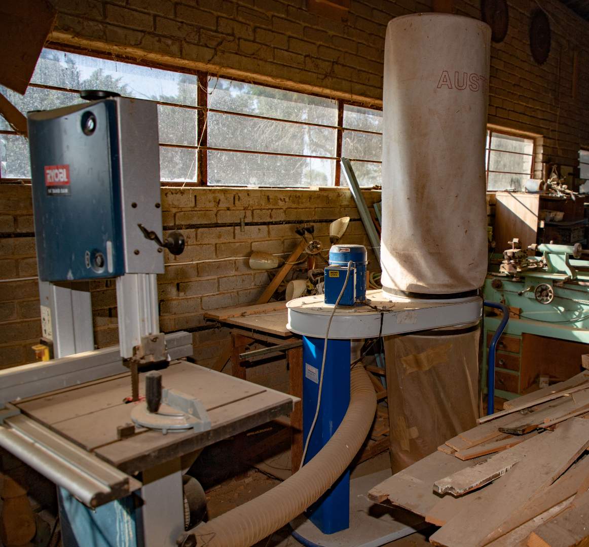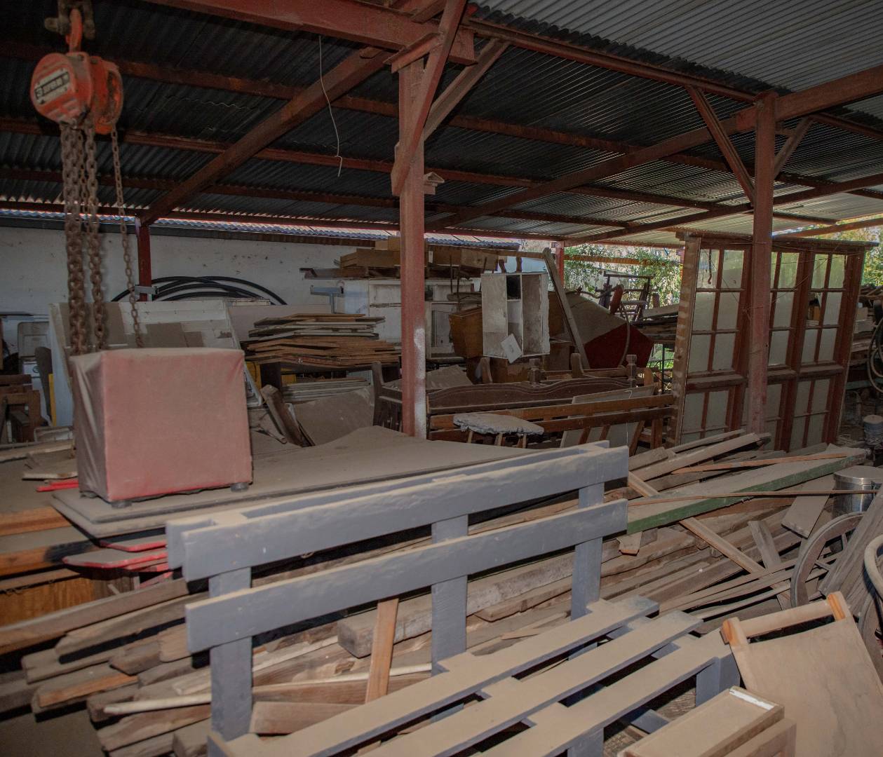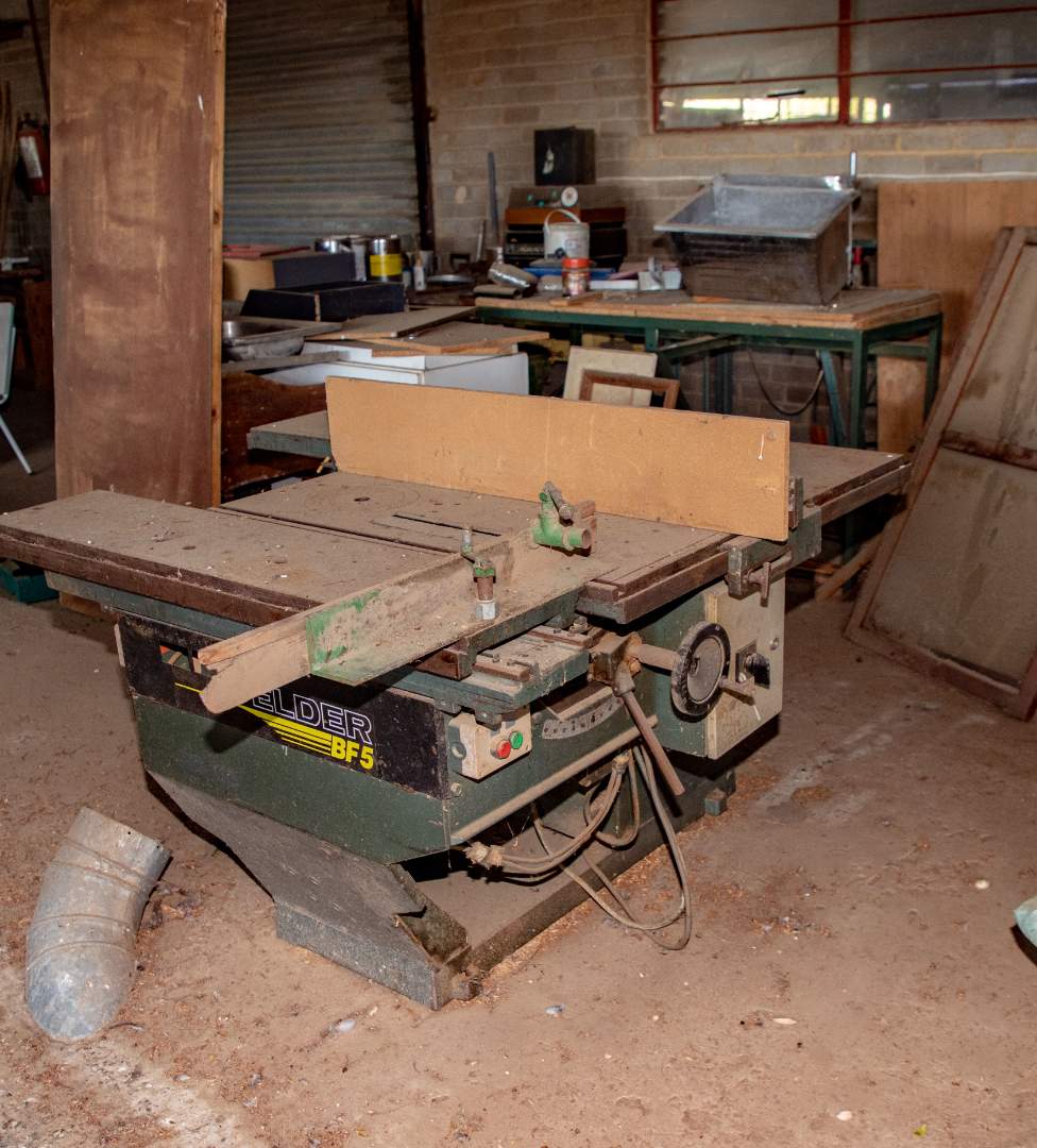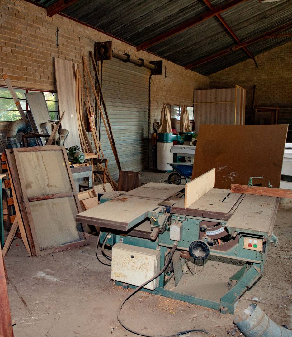 - A large under-roof area currently used for storing timber and woodworking machinery