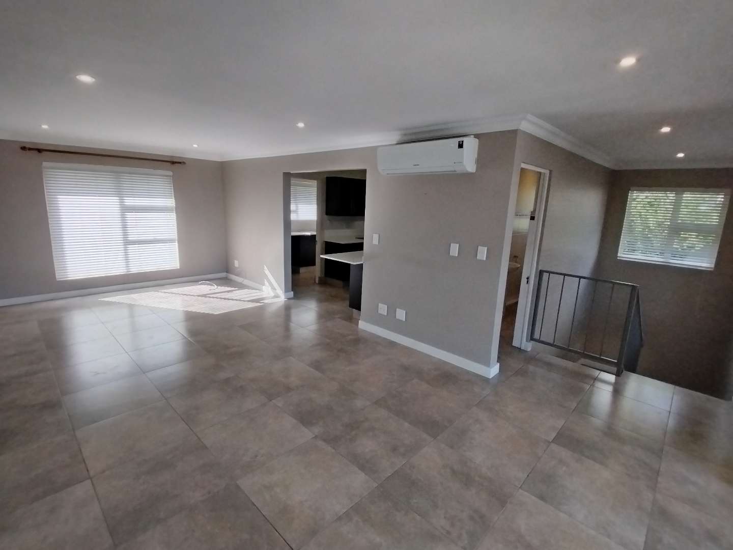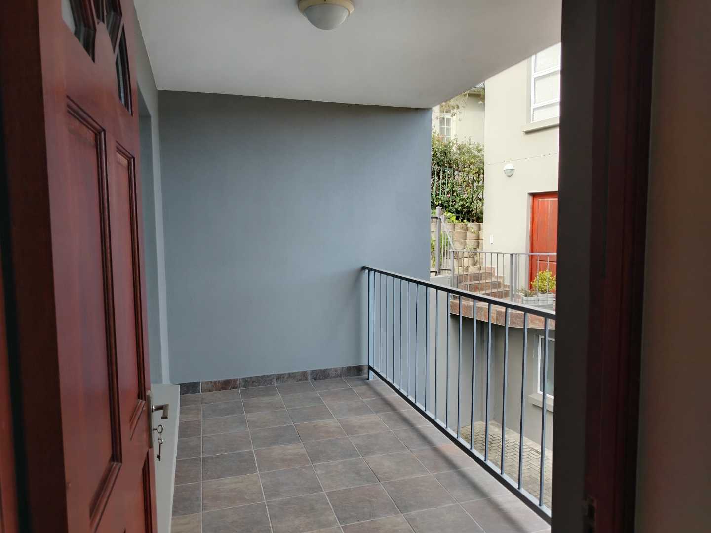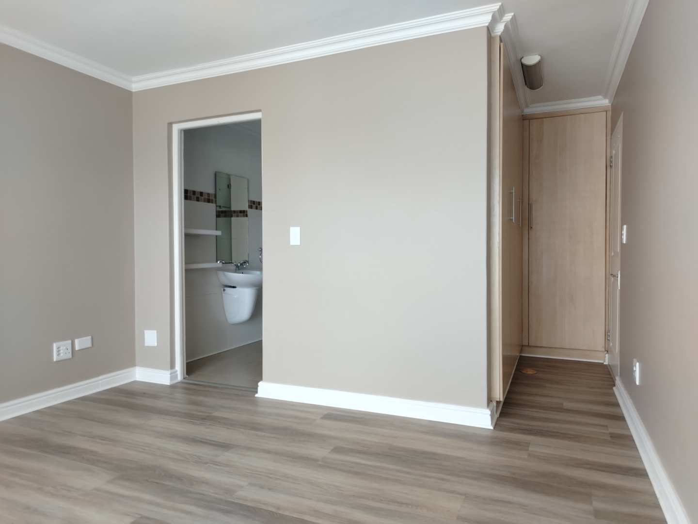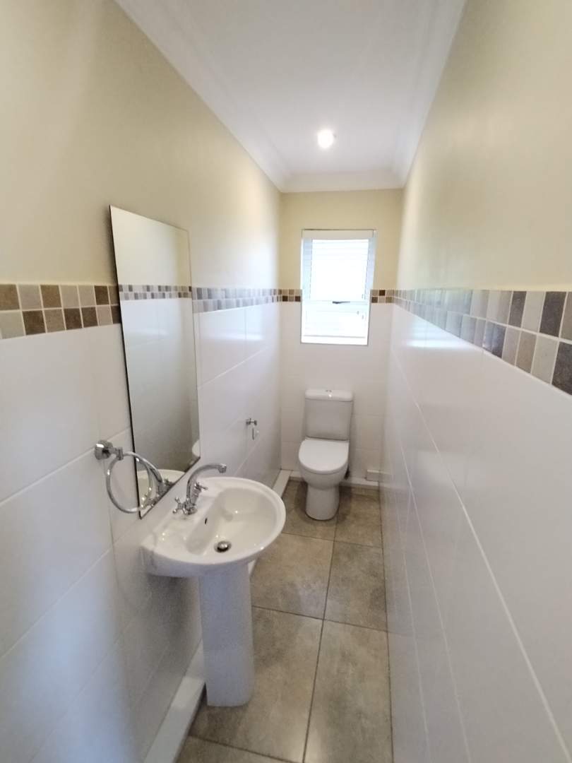 The first floor houses three bedrooms. The main bedroom enjoys its own private balcony with stunning views of the Knysna estuary, a newly renovated en-suite bathroom with a walk-in shower, and brand-new laminated flooring. The second and third bedrooms, filled with warm northern sunlight, are carpeted for comfort and share a modern bathroom with shower. Extra cupboard space in the corridor adds to the practicality of this level.