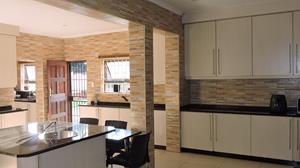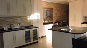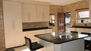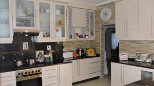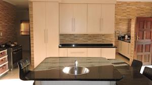At the heart of the home lies the kitchen—a chef's paradise. It boasts a modern central island with sleek granite countertops and ample cupboard space for all your culinary needs. The kitchen is complemented by a spacious pantry, as well as a separate laundry and scullery area for added convenience.