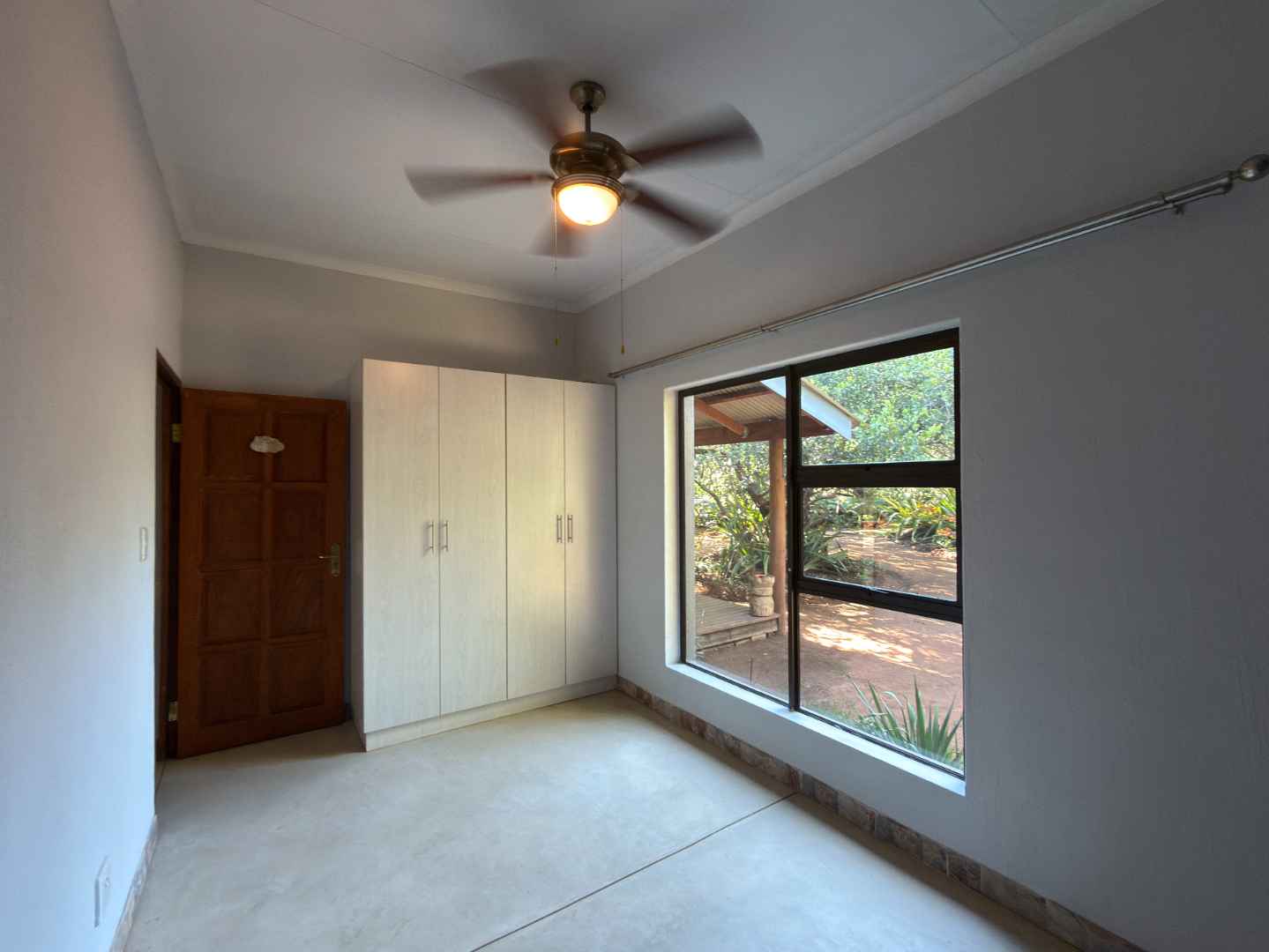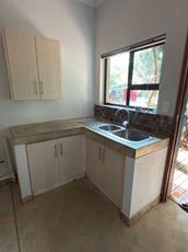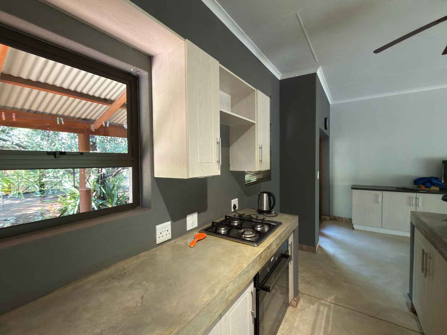 - Kitchen Gas hob, electric oven, ample cupboards, central island double wooden door opening onto the back veranda and garden area