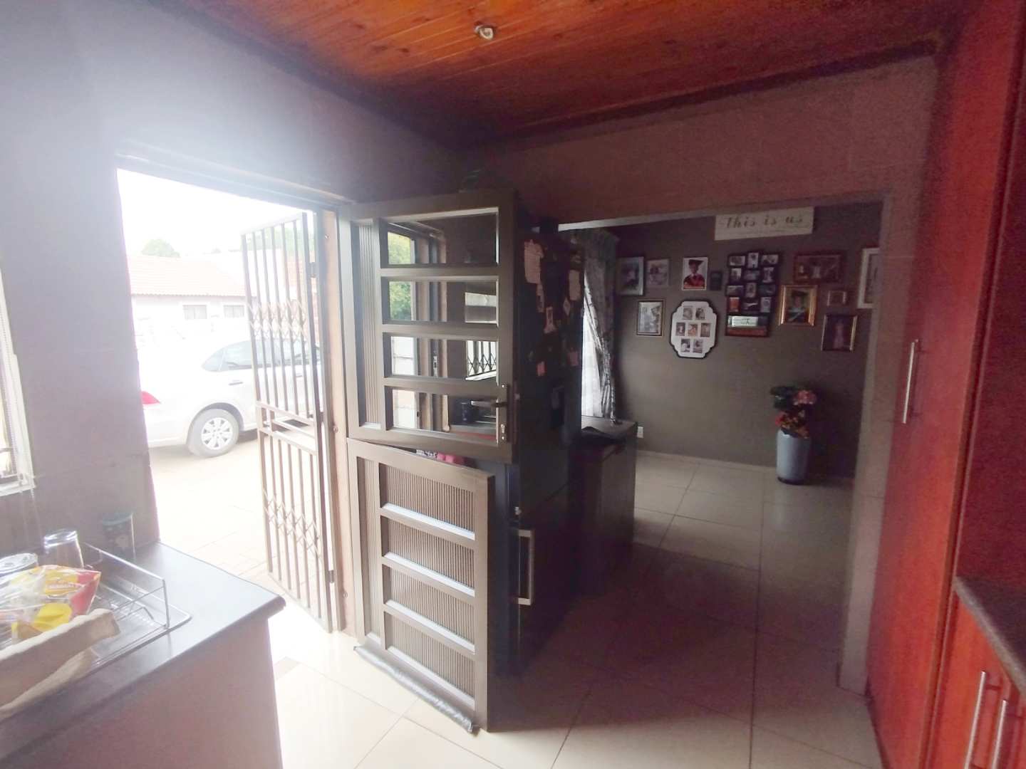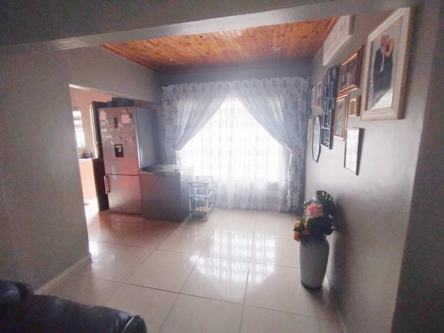 - Spacious Open-Plan Living and Dining Area: The open layout creates a warm and inviting environment, accentuated by wooden ceilings and tiled floors, perfect for family gatherings and entertaining guests.