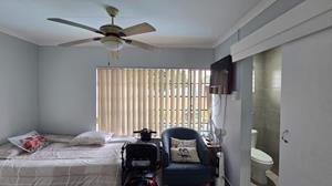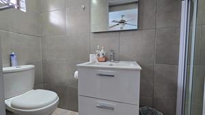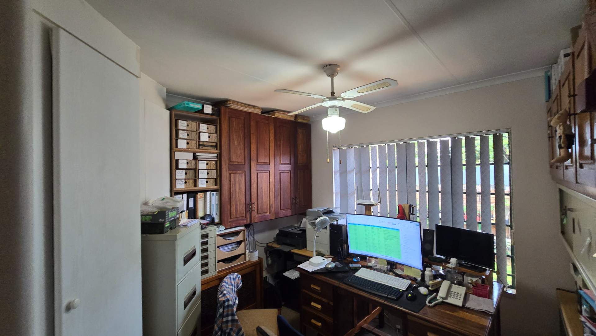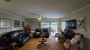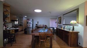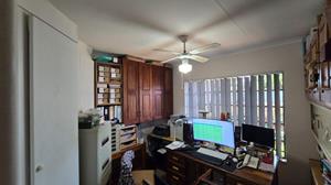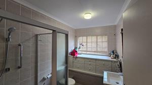 The expansive lounge, adorned with elegant laminated floors, connects to the areas with three bedrooms. One of these bedrooms is currently used as a study, featuring plenty of built-in cupboards. All bedrooms have ceiling fans. The guest bathroom is tastefully designed with a shower, toilet, basin, and bathtub. Both bathtubs are currently covered with additional cabinets, which can be easily removed if desired.