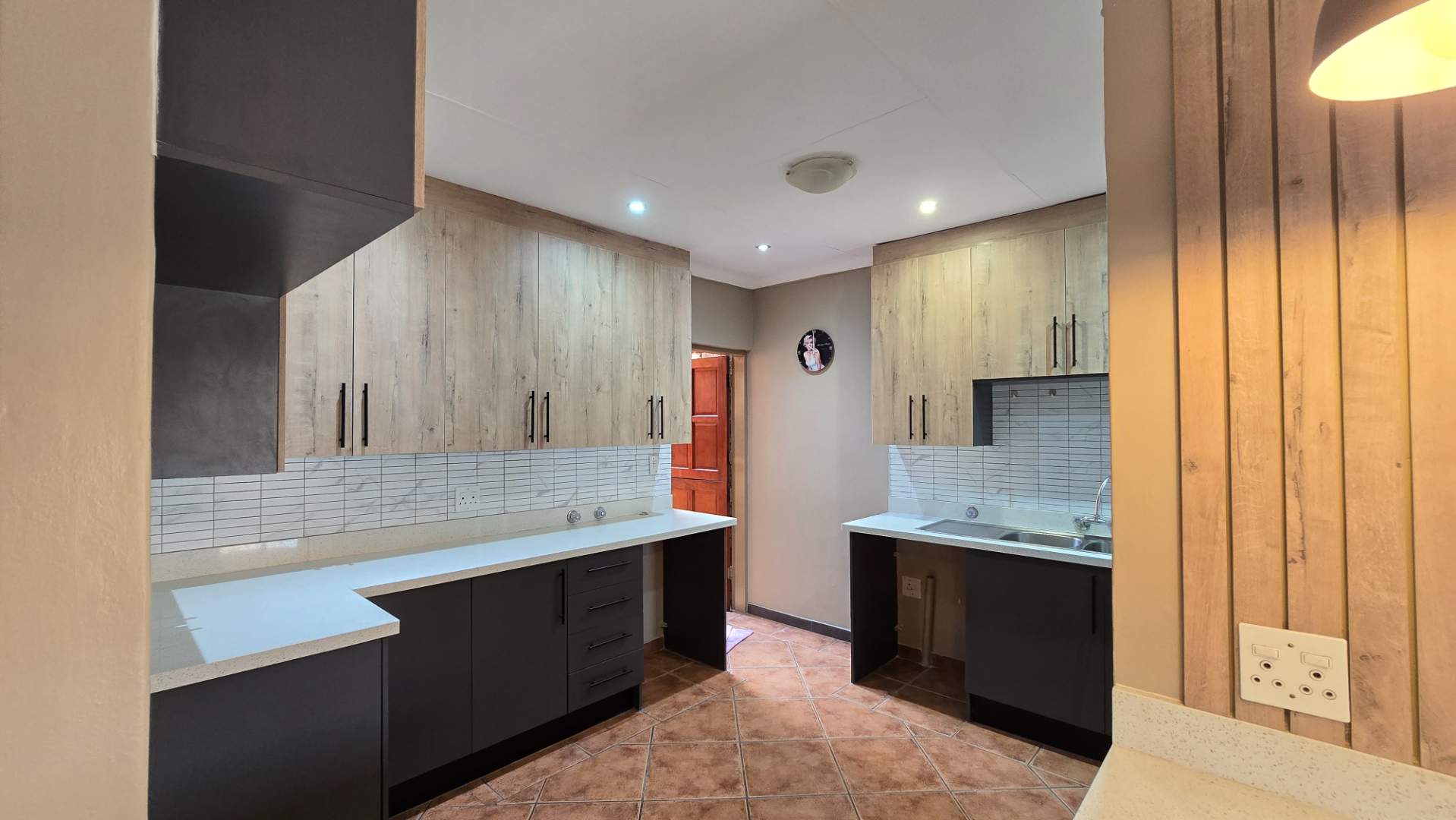 Step inside to find a fully tiled lounge that provides ample space for both a comfortable lounge suite and a dining table. The modern kitchen is a chef's delight, featuring room for a double-door fridge, washing machine, and dishwasher. Enjoy preparing meals at the breakfast nook, illuminated by contemporary lighting and surrounded by sleek cabinetry and a double basin.