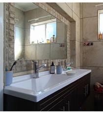 The modern kitchen boasts ample cupboard space and a cozy breakfast nook framed by wooden windows, where morning sunlight fills the heart of the home. From the kitchen, step out to the back door, which opens to a tranquil garden and braai area, complete with a water feature—a perfect retreat for unwinding after a busy week.