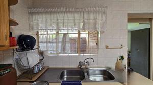The generously sized kitchen boasts ample built-in cupboards, melamine countertops, and essential appliances including a stove and washbasin. A separate laundry room caters to all your washing and cleaning needs, adding to the home's practicality.