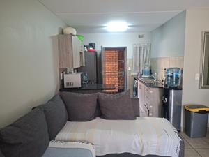 The living area boasts a cozy lounge seamlessly integrated with an open-plan kitchen. The kitchen is equipped with sleek melamine cupboards, elegant granite countertops, a hob, and an under-counter oven, making it a delightful space for culinary adventures.
