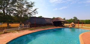 A thatch-roofed lapa, BBQ boma area, and swimming pool for relaxation and entertainment.