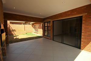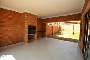 The living room is a large, light-filled space with tiled flooring, cream walls, and Trellidor security. Sliding doors open onto the covered patio, which boasts a built-in braai and a charming garden.