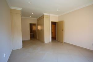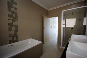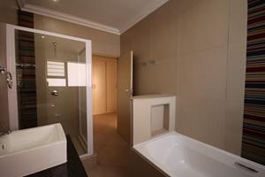 The master bedroom is truly remarkable, offering generous space, neutral decor, cream walls, tiled flooring, and a good range of storage cupboards. The contemporary en-suite bathroom is beautifully designed with a bath, shower, and decorative wall and floor tiles.