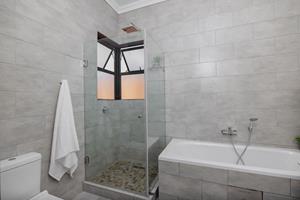 The allure of this level extends beyond the interior, as it opens onto an expansive patio, complete with a built-in braai. From here, indulge in the breathtaking views of the enclosed, private garden, a tranquil oasis that beckons you to unwind. A guest toilet on this level ensures convenience for you and your guests.