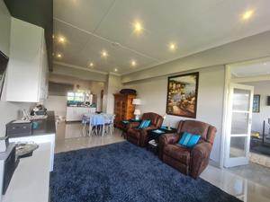 The spacious open-plan dining room and lounge area is perfect for entertaining or relaxing. It boasts very modern built-in display cupboards and counters, along with a convenient built-in bench. LED downlights illuminate the space beautifully, creating the perfect atmosphere for any occasion. All blinds are included, providing privacy and style.