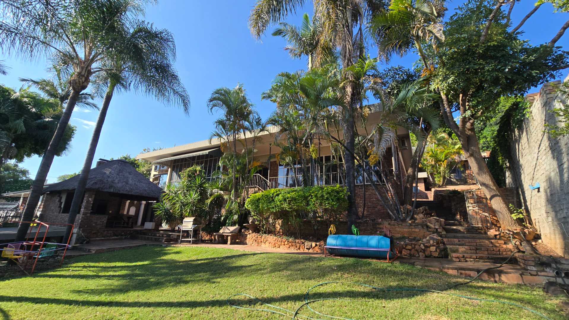 Outdoor living is enhanced by a thatch lapa with a built-in braai at the front of the house and a huge entertainment area with another built-in braai, protected by canvas sides for year-round enjoyment. There is also an extra storage room for your convenience. The property boasts a large pool, which currently requires some maintenance.