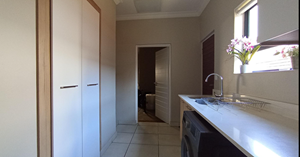 The beautiful kitchen is a true centerpiece, featuring an elegant island nook, abundant cupboard space, and sleek granite countertops. A separate laundry and scullery easily accommodate all your appliances and a double-door fridge, ensuring daily living is as practical as it is stylish.