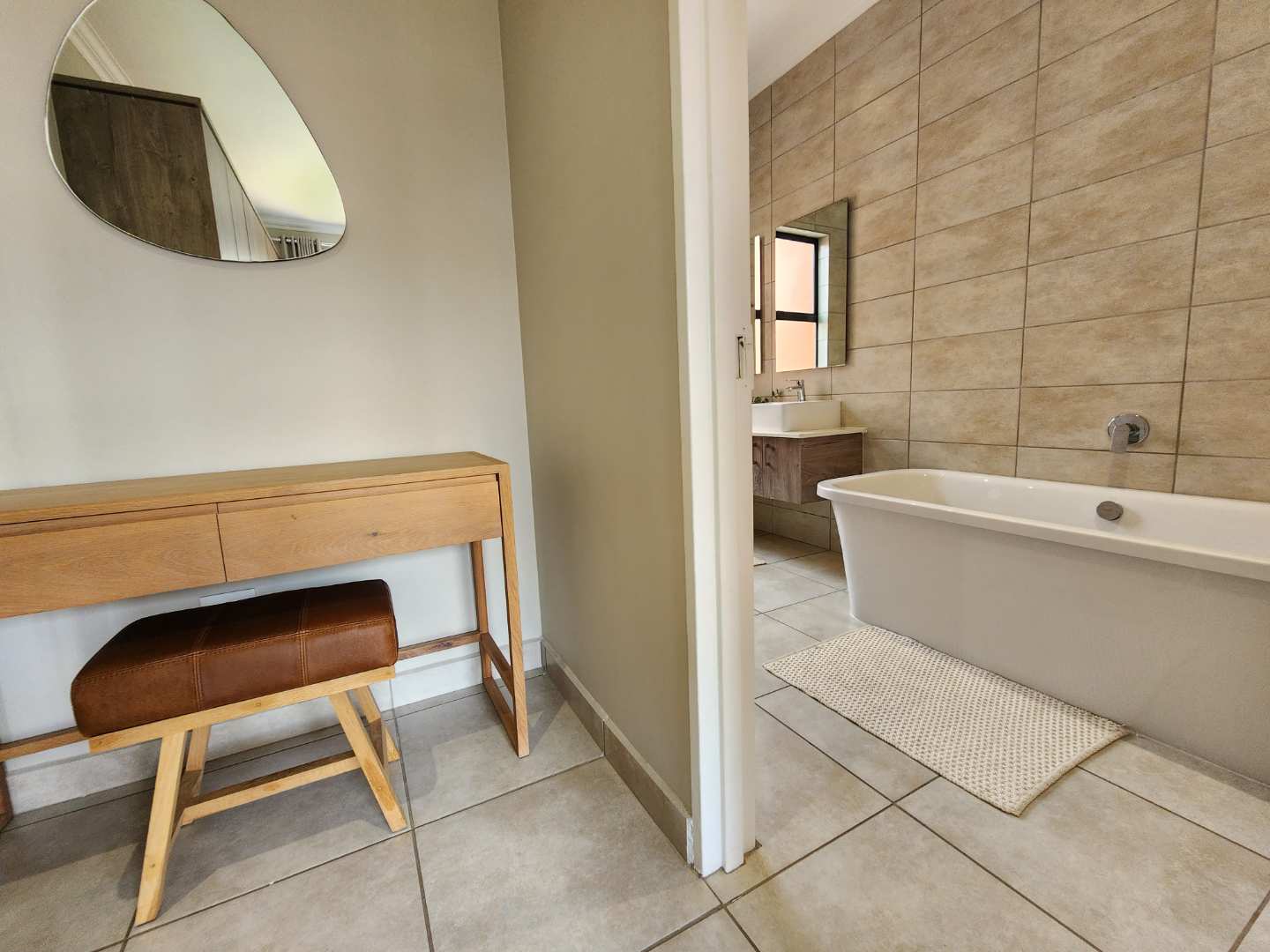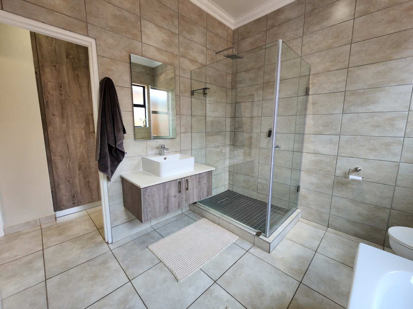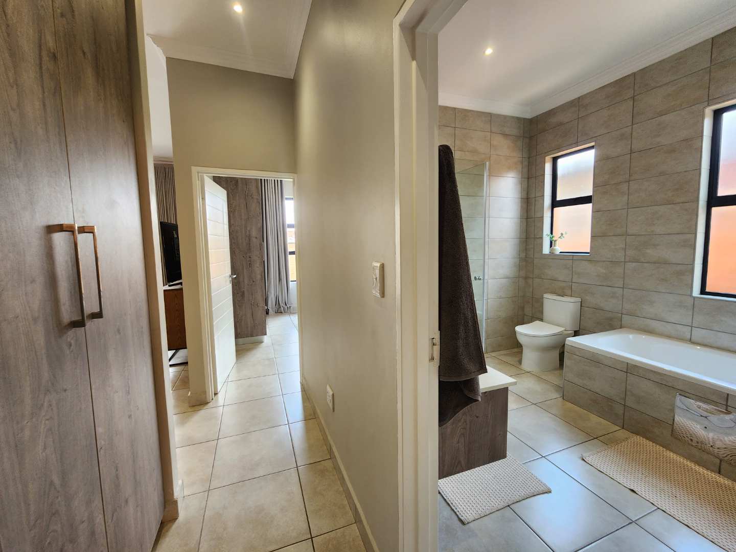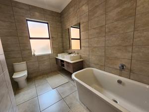 The luxurious main bedroom features a walk-through cupboard leading to an en-suite bathroom, complete with a large bath, expansive shower, double basin, and toilet.