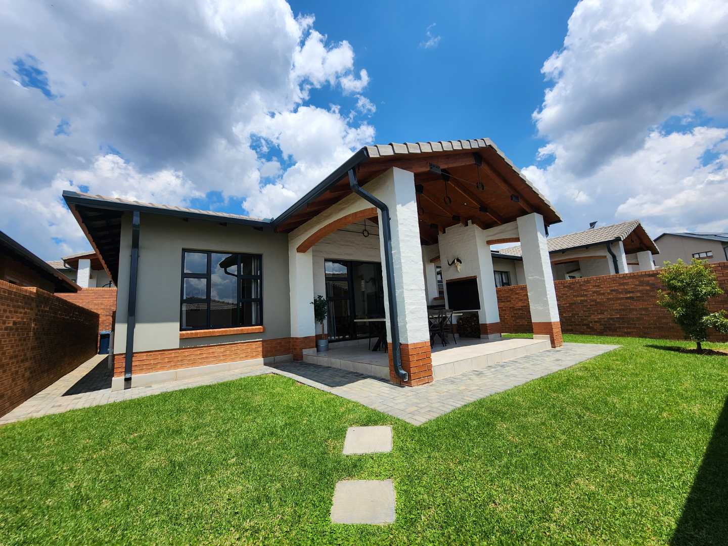 Each home boasts a stunning open-plan design that seamlessly integrates the kitchen, dining, and living areas with a large patio covered with glass all around and that features a built-in braai. This inviting space opens up to a private garden, perfect for entertaining or simply relaxing in your own outdoor oasis.