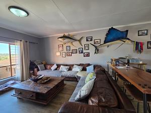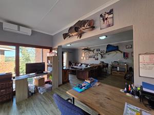 Upon entering, you'll be greeted by an elegant open-plan living space that seamlessly connects to a contemporary kitchen, complete with a separate scullery and wash-up area. The living area is accentuated by exquisite wooden French sliding doors that open onto a fully enclosed patio. This inviting space features a built-in braai, ideal for year-round entertaining while enjoying the stunning views available from both the living area and the bedrooms.