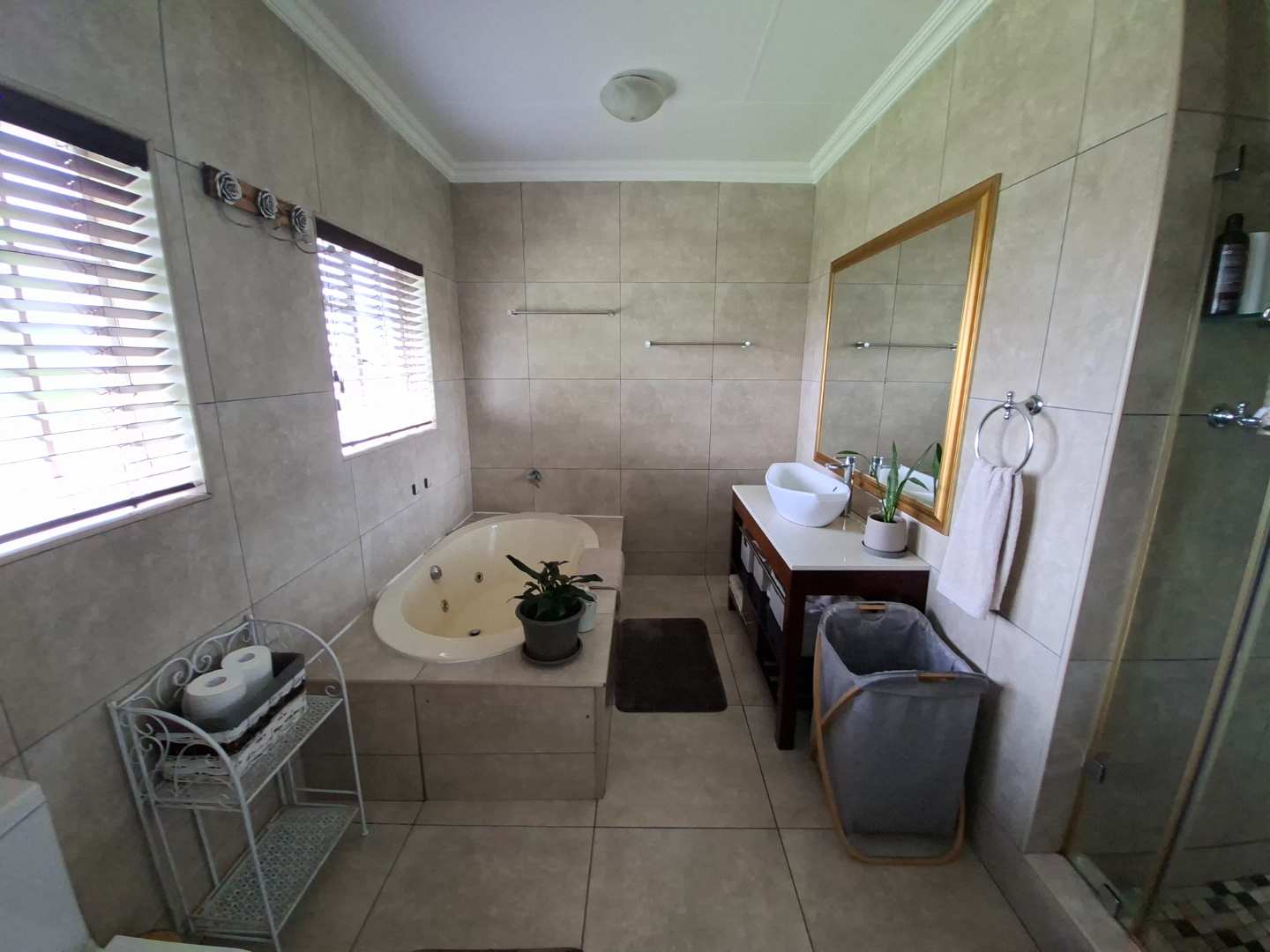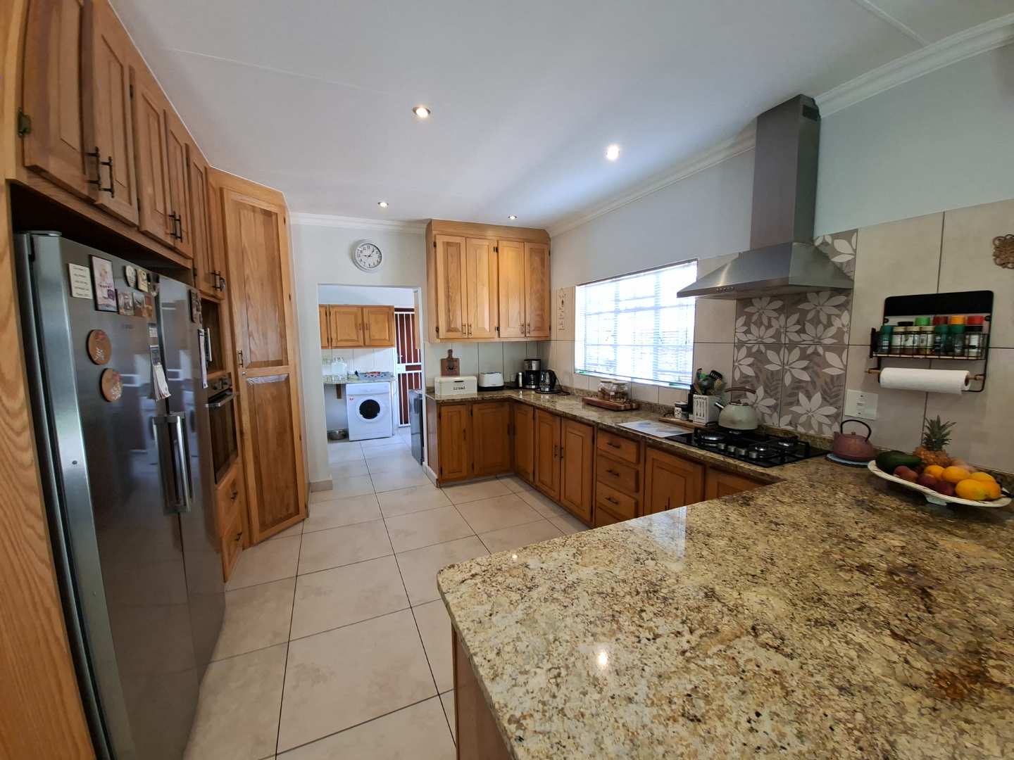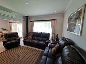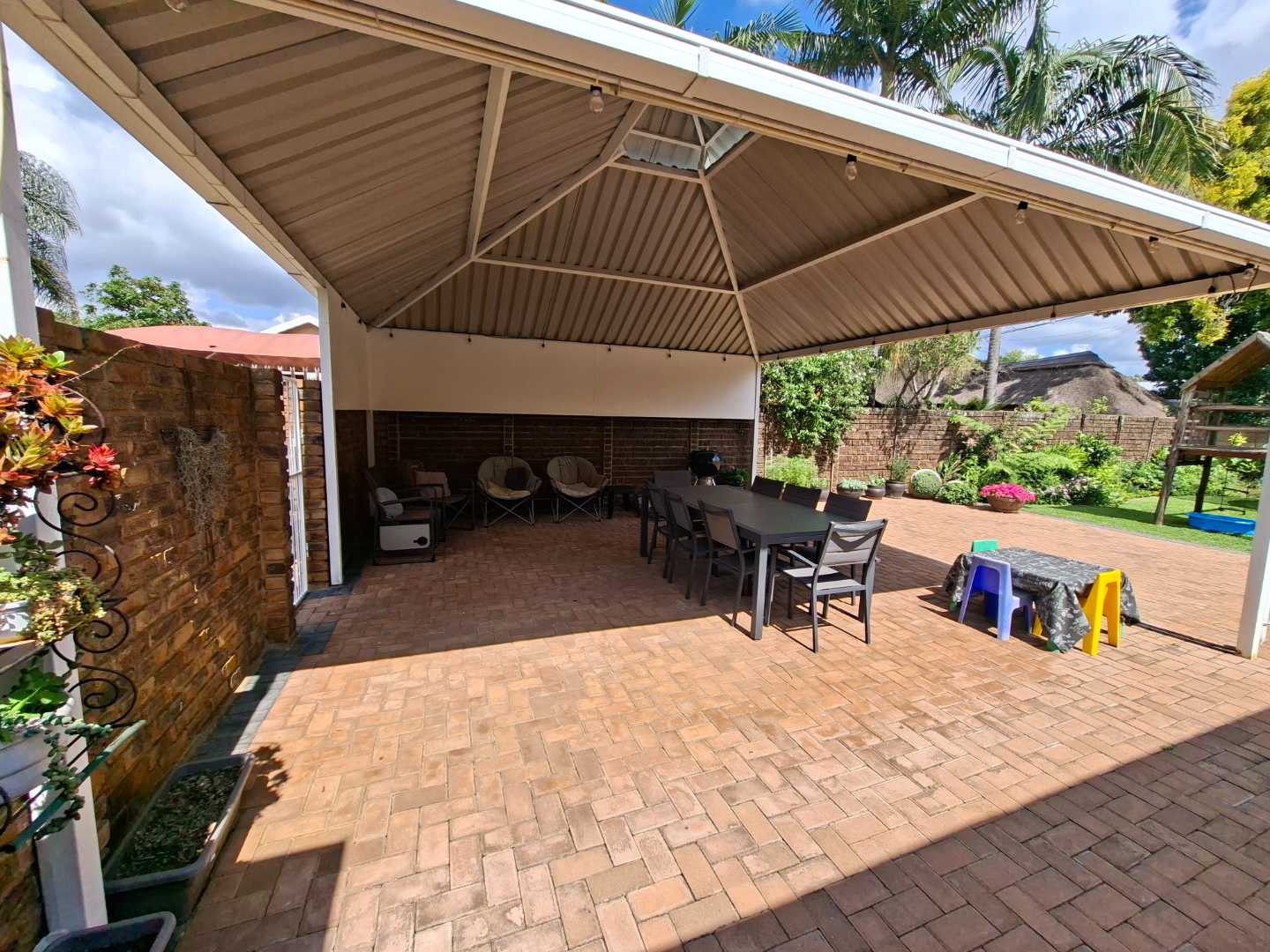 Enjoy cozy evenings in the lounge with a fireplace and tiled flooring or relax in the second tiled lounge. The open-plan dining area seamlessly connects to the kitchen, making it ideal for family gatherings or entertaining guests. The newly revamped kitchen features ample storage cupboards, granite countertop, a gas stove, an oven, and a convenient scullery.