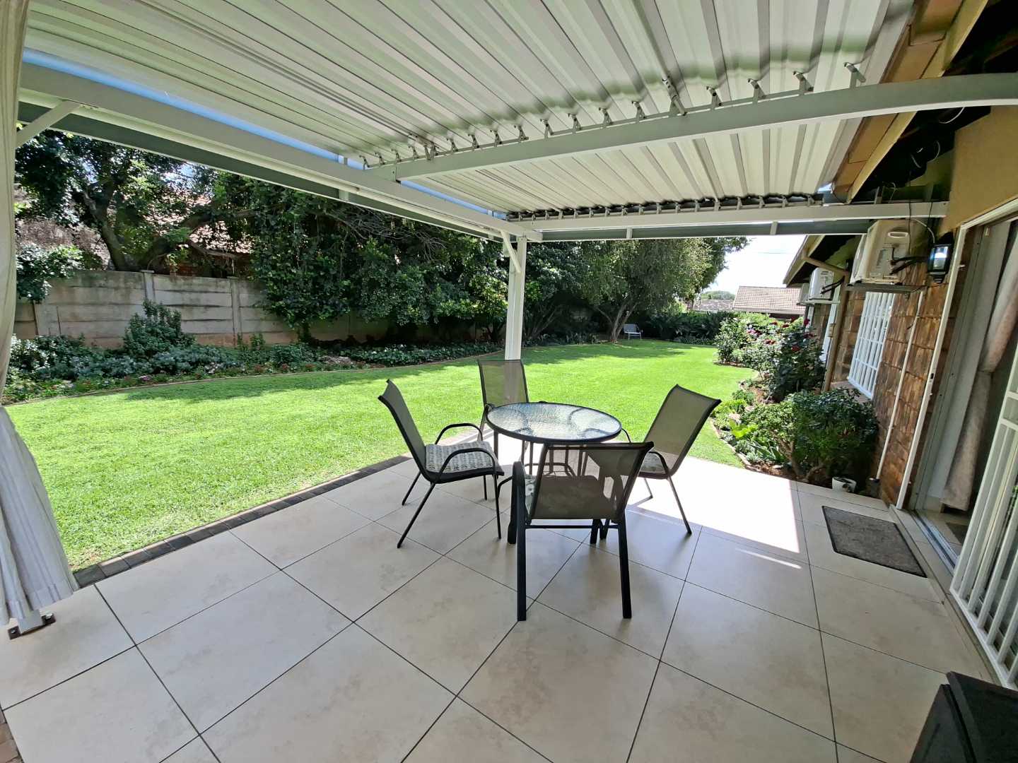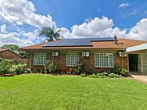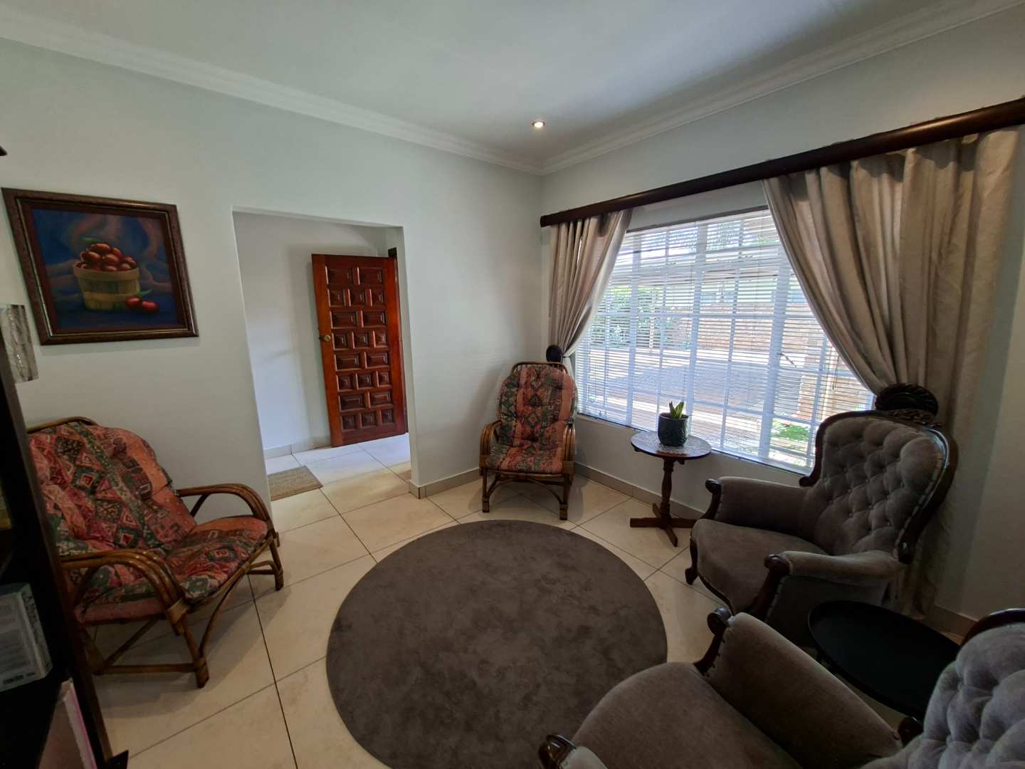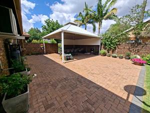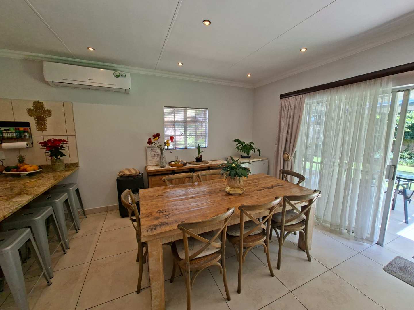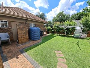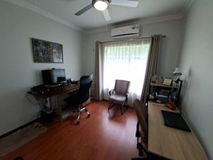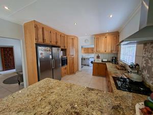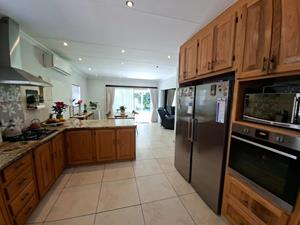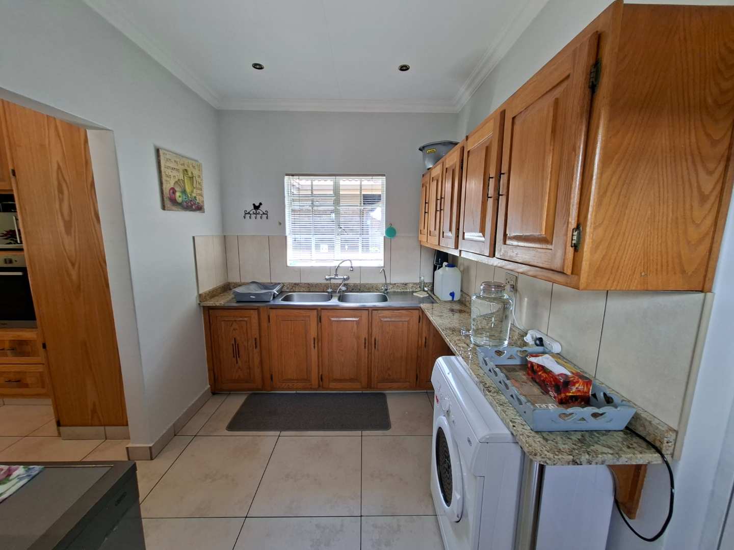 Enjoy cozy evenings in the lounge with a fireplace and tiled flooring or relax in the second tiled lounge. The open-plan dining area seamlessly connects to the kitchen, making it ideal for family gatherings or entertaining guests. The newly revamped kitchen features ample storage cupboards, granite countertop, a gas stove, an oven, and a convenient scullery.