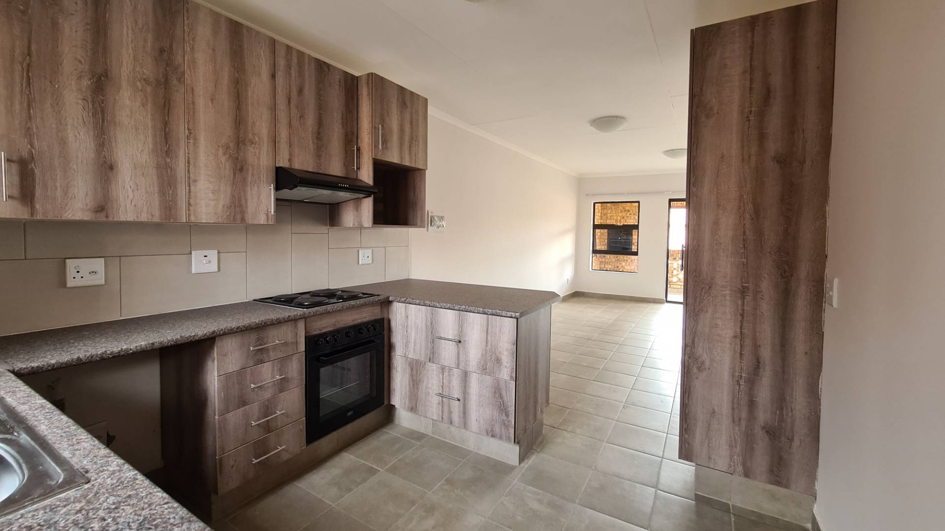LIVING ROOM: Open-plan lounge with DSTV Plug & Play and optional internet (ITTX-Telecoms Internet Fiber). The sliding door leads out onto a covered patio with a built-in braai and garden.