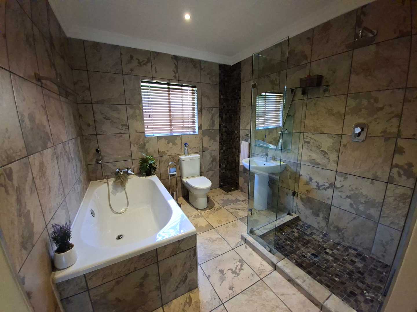 This home features three generously sized bedrooms, each adorned with stylish tiles and built-in cupboards for ample storage. The main bedroom has the added luxury of an ensuite bathroom, while the first bathroom offers a full suite with a shower, bathtub, basin, and toilet, ensuring convenience for family and guests alike.