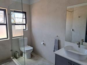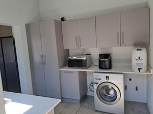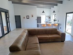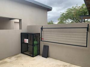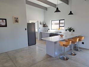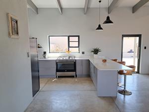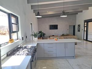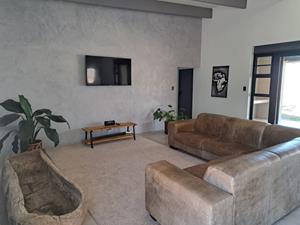 As you step inside, you'll be greeted by an open-plan living space that seamlessly integrates with the outdoor surroundings, creating a harmonious flow throughout the home. The living areas have high ceilings and two ceiling fans. The state-of-the-art kitchen features top-of-the-line appliances and sleek finishes, which are ideal for culinary enthusiasts and entertaining guests, boasting a 5-burner gas oven and hob. The separate scullery has enough space for 3 appliances, a double washbasin and ample cupboard space. Outside you will find the courtyard with a safety cage for 2 gas bottles. The courtyard leads to the roof-covered double carport with additional parking space.